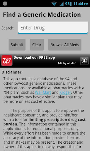 This app contains a database of the $4 and other low-cost generic medications. These medications are available at pharmacies with a "$4 plan", such as Wal-Mart or Kroger. Other pharmacies may have a similar plan that may be more or less cost effective. In the future, more drugs and a more detailed pricing scheme will be implemented in this app.