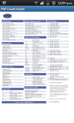Developer's cheat sheets in your android tablet: Arduino, ASCII, ASP, C++, CHMOD, CSS, Drupal 7, regular expressions, HTML, HTML5, JavaScript, jQuery, Microformats, mod_rewrite, MySQL, PHP, PostgreSQL, Python, RGB, Ruby on Rails, SEO, Smarty, SQL, SVN, Symfony, Wikipedia and Wordpress.