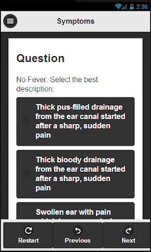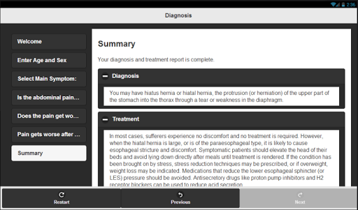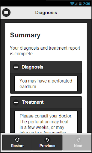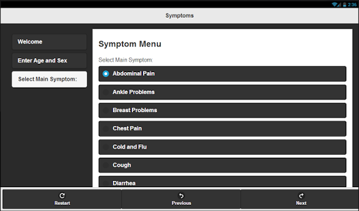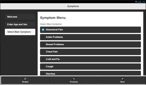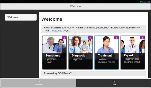 CheckMySymptoms guides the user through a symptom collection survey. The result after the survey is a listing of possible diagnoses and treatment options.