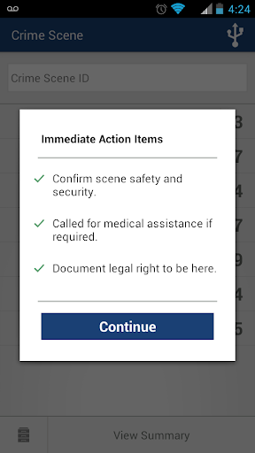 This app is for first responding officers. It is neither intended for nor should be used to replace crime scene processing units. Additionally, all departmental, jurisdictional, and governmental policies and procedures should supersede app checklist procedures.