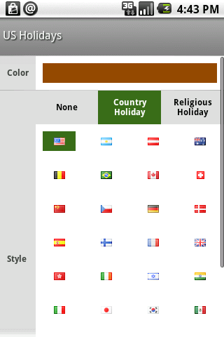 日曆可以查看日曆型(國家假期,宗教節日等),根據不同的風格。請訪問http://calendar.greenbeansoft.com/calendar-style支持日曆樣式。