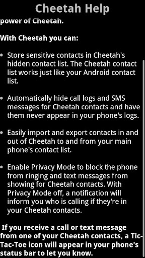 Cheetah provides you with 100% total privacy. Never again will you panic when your significant other picks up your phone. Cheetah is a hidden phone book which stops all calls, call logs & text messages for those special contacts. The hidden phone book is behind a simple game of Tic-Tac-Toe with access via a four digit pin.