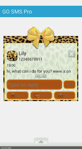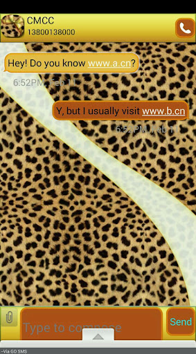 This go sms theme is all cheetah print with brown and gold chat room bubbles and a pretty yellow bow in the pop up and in box. If you like girly themes you will love this one.
