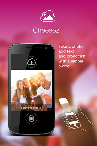 Cheez is the simplest and most efficient way to share instants with friends. Just a finger swipe is needed to broadcast the photo.