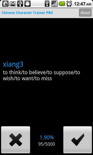 This app uses an intelligent algorithm to teach Chinese characters using flashcards. The characters are based on the Jun Da Character frequency list of Modern Chinese. Definitions are from CC-CEDICT.