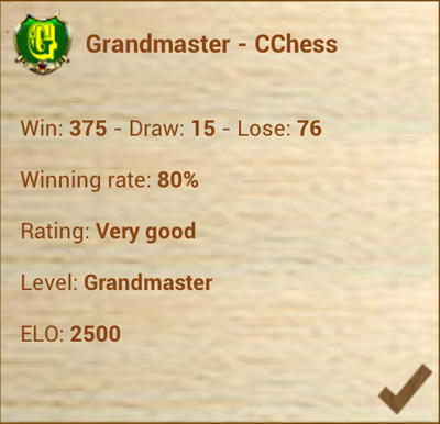 - The game has ELO points system when you play with computer, to classify the level of player, there are 12 levels of qualification from Training to Super grandmaster, respectively ELO 1600 to 2700. stats number of win - draw - lose game,