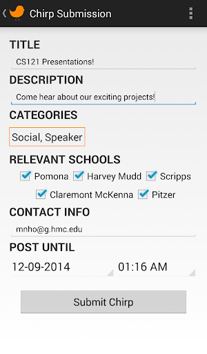 Chirps is an application for the five Claremont Colleges. The main feature is that students are able to post announcements to relevant schools, and they are also able to view announcements relevant to their own school. The project was motivated by an existing system with the same name at Pomona College, which is the primary method of communicating events and other announcements to the entire student body. Students submit announcements, or "chirps", by email or through a web form to the administrator of the Chirps system. The administrator then manually generates a daily email containing the approved Chirps, loosely categorized into preset categories like social, academic, and for-sale listings.