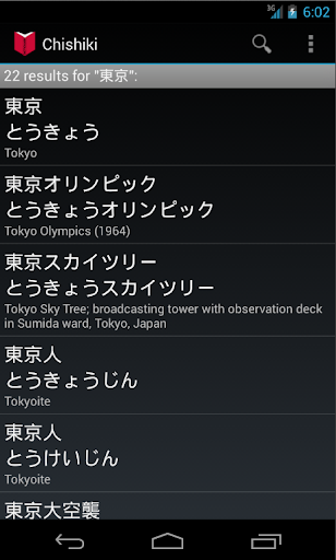One can search for an item in the dictionary in kanji, hiragana, katakana, or English by using the search dialog in the action bar. One can also see search suggestions while typing in data in the search dialog in the action bar. The detailed information page describes more information about the selected dictionary entry. The definitions are given in English only. This application also does not offer ro-maji at the moment so you must understand hiragana and katakana to use this application.