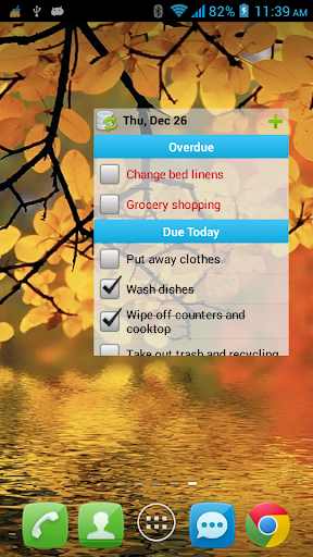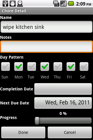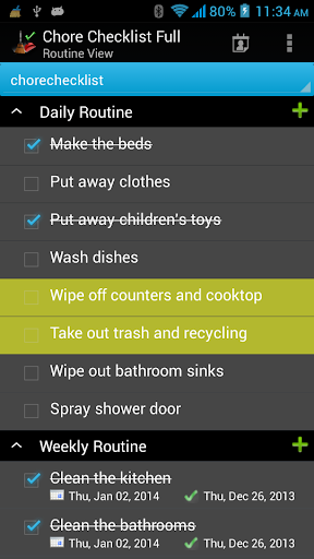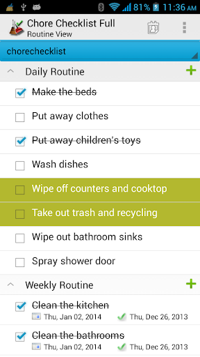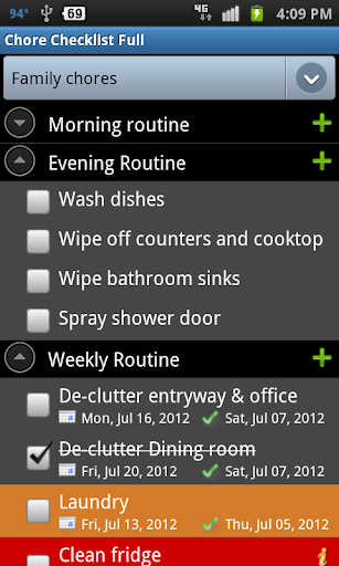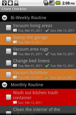 It comes with a pre-loaded check list which has routines, such as "Daily Routine", "Weekly Routine", "Monthly Routine" and etc. You can edit them or add new routine/chores. You can set star/end date, reminder, progress and notes for each chore.