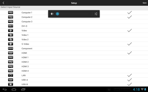 • Input source selection: choose from two computer ports, two USB ports, HDMI, Video, S-Video and LAN