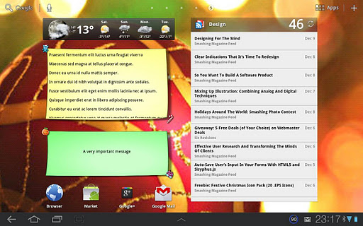 - Multiple widget sizes to choose from, free resizing available on Honeycomb and Ice Cream Sandwich phones and tablets