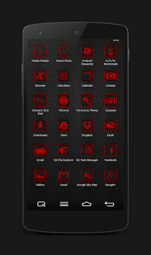Chrom'd Sq'd Red is a square icon pack for Android Launchers. It features an elegantly styled red chrome finish upon a slightly matte black background that complements many genres of desktop design.