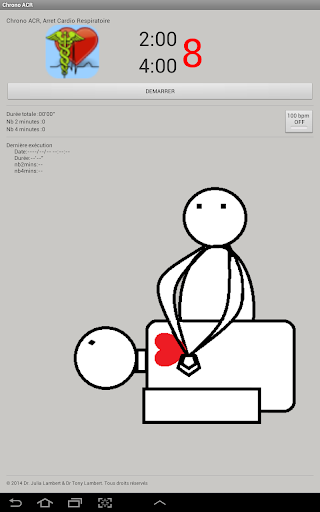 Chrono ACR est une application destinée aux médecins et aux infirmiers permettant de rythmer une réanimation cardio-pulmonaire (RCP). Deux signaux sonores différents déclenchés toutes les 2 et 4 minutes permettent de repérer dans le temps les moments d’analyse du rythme cardiaque et d’injection d’adrénaline. Ce chronomètre médical comptabilise automatiquement le nombre de cycle de RCP, le total d’adrénaline injectée ainsi que la durée totale de la réanimation. De plus, un métronome peut être activé afin de faciliter des compressions thoraciques à un rythme de 100/min.