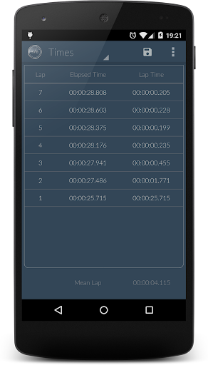 As you record laps with the stopwatch, they are added to a list in the "Times" view. The laps are ordered in descending order. For each lap in the list, you can see the lap number, the elapsed time, and the lap time. The elapsed time is the time past from the beginning of the measurement up to the moment when the lap was added. The lap time is the time past since the previous lap was added. At the bottom of the screen, you can see the average of your lap times. The "Save" button placed on the action bar allows you to share your list of lap times by sending it to one of the appropriate apps installed in your device (Gmail, Dropbox, Drive, Facebook, etc.).