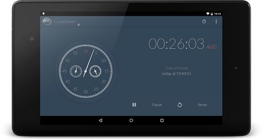 The countdown feature allows you to set a to timer. By using the corresponding buttons, the countdown can be started, paused, resumed, and reset. When time is up, you receive a notification, according to your settings: a sound alarm, a vibration, and / or a message on the notification bar (if the app is running in background). The "Set Timer" button placed on the action bar allows you to rapidly set the timer. In landscape mode, in addition to the time display, you can see the date and time when the countdown will finish.