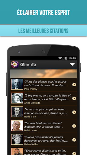 Développer votre vocabulaire et eclairer votre esprit par les meilleures citations et proverbes des grands personnages de l’histoire. L’application « Citation & Proverbe D’or » vous offre une panoplie de perles rares des citations et proverbes. Une base de données riche et actualisée des meilleurs citations et proverbes est à télécharger gratuitement.