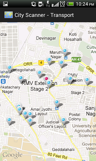 City Scanner is Smart App, which can be used to find the categorized locations & addresses like Transport, Educations etc. This app is most useful when user is in unknown location/area where he wants to find out location & address information based on his current location. This app provides simple user friendly Home screen where user can choose category of his interest, after his selection app will search the location information related to that category & plots on Map. By Clicking on Markers App will display the address information.