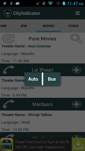 ✔ Get list of latest Movie shows in your city(Call and Travel(Bus/Auto))