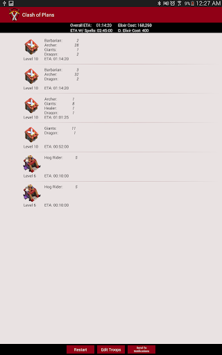 Clash of Plans provides users with the ability to build their CoC army as fast as possible! Its simple! Tell Clash of Plans which army troops you would like to build and the app tell you how to build them! Clash of Plans will tell you which army troops to build in each barracks available, how long it will take to build these troops, and how much elixir it will cost you. Clash of Plans is the perfect army planner for any fan of the official game.