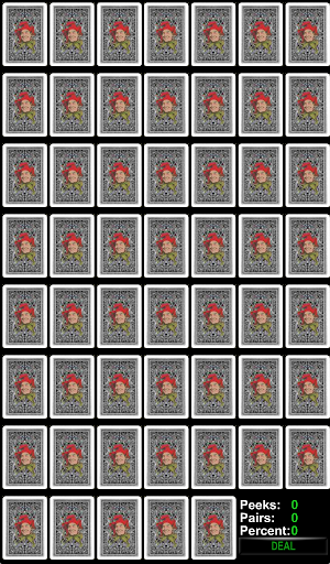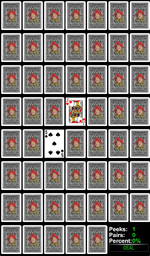 Improve your memory skills with this classic single player card game called Concentration. Cards are shuffled and dealt face down. Match pairs and try to remember card locations. The game is scored Pairs / Peeks = Percent. Improve your score and your memory as you enjoy this casual and fun game. Suitable for all ages.