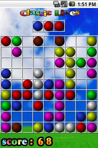 In this puzzle game you need to build a color lines (5 or more balls with same color). You can move one ball from one cell to another, by clicking on ball and on target cell. If line assembled, then it will be removed and score will be increased. You can move one ball in cycle. Use menu button for additional actions.