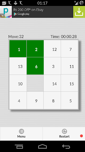 Frame of numbered square tiles in random order with one tile missing.The object of the puzzle is to place the tiles in specific order by making sliding moves that use the empty space.