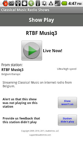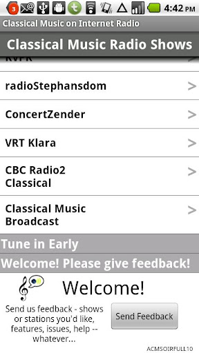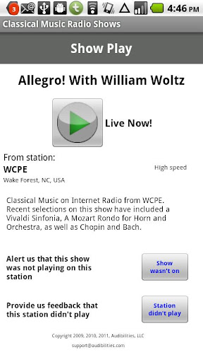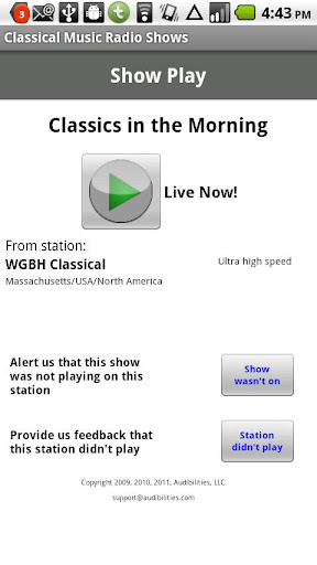 Listen to classical music shows streaming live on internet radio. This application provides up to the minute show schedules and “one click to play” access to internet radio streams playing the top classical music shows.