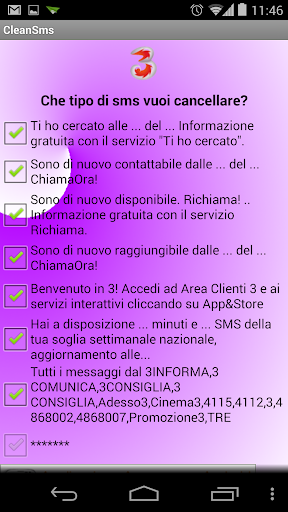 Volete cancellare gli sms noiosissimi dei vostri operatori? Tipo “Hai ricevuto una chiamata da..” oppure “Sono di nuovo contattabile.. ChiamaORA!” che si sommano nella tua rubrica SMS? Clean SMS pulisce automaticamente questi tipi di messaggi in modo completamente automatico dalla tua rubrica.E' disponibile per gli operatori TIM, VODAFONE, WIND,NOVERCA, TRE, POSTE MOBILE. Se volete che il programma cancelli altri tipi di messaggi, contattatemi pure, sarà un piacere implementare la vostra richiesta.