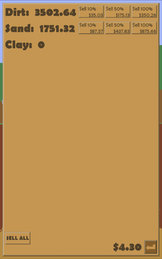 Start with a shovel and a little plot of land, and then dig, sell, and upgrade your way to a very large mining operation. There are a variety of materials to dig through, each with its own sell price. There are also upgrades to help you along your way. Don't forget to start a new hole every once in a while to gain experience points and make the digging just a bit easier. Good luck!