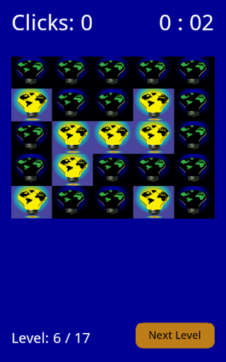 Click Off is a challenge/strategy game that forces your brain to develop a strategy to completely turn off all light bulbs on the board. Develop fun, Challenge your friends to find out who is able to turn all lights off in the shortest amount of time. Use this game to maintain children and students concentrated on figuring out the best possible way to turn all light bulbs off while working with a partner or in groups.