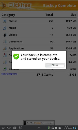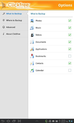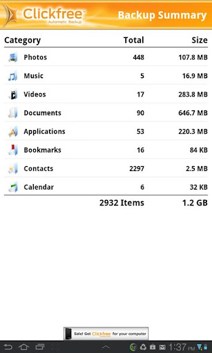 Clickfree is fully featured and automatically backs up all your valuable content locally, to SD card or to your cloud storage account. Clickfree Mobile Backup supports ElephantDrive, Dropbox, Box, SkyDrive, Google Drive and SugarSync.