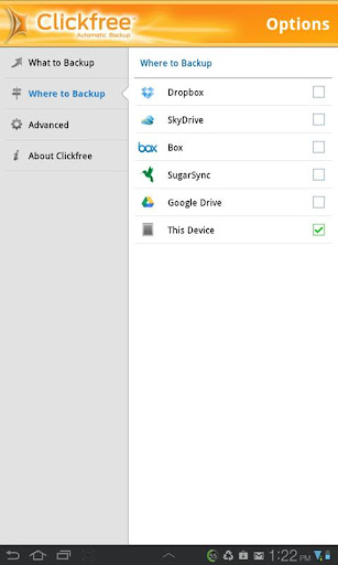 - Backup locally, to your SD card or to your cloud storage account. Clickfree Mobile Backup supports ElephantDrive, Dropbox, Box, SkyDrive, Google Drive and SugarSync