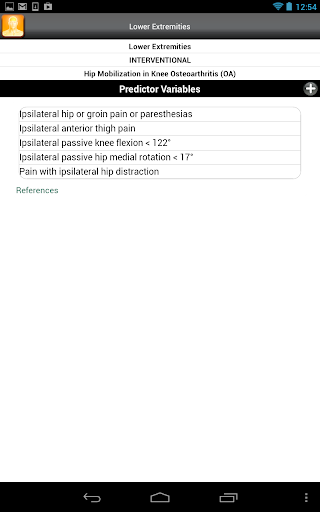 This application offers a comprehensive look at clinical prediction rules (CPRs) as they relate to physical therapy practice. Pertinent information is readily accessible to influence clinical decision making while also providing sufficient depth. CPR development level is provided, a quality assessment score is listed as well as a clinical bottom line paragraph to provide the user with a summative statement. The predictor variables are well described and include multiple color pictures for clarity of explanation and ease of reproduction. To further assist the user in their utilization of clinical prediction rules this application includes a decision making algorithm calculator as well as multiple case studies demonstrating the inclusion of such rules into an evidence-based clinical scenario.