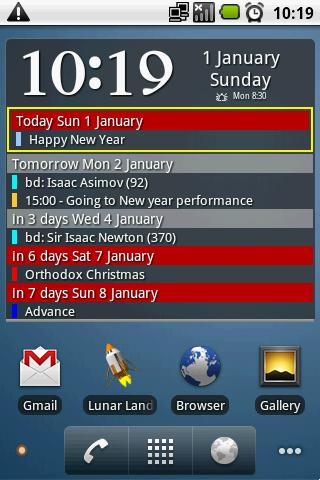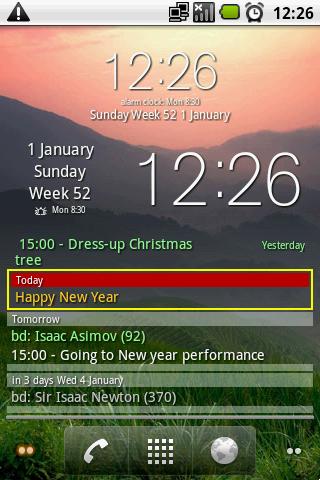 A widget of the current time, date, alarm, birthdays contacts and calendar events, weather, google tasks (Gtasks and CalenGoo), and a shopping list of programs DrShopper and LazyShopper, with an opportunity to set each event the number of days before the event when it would be displayed in the widget.