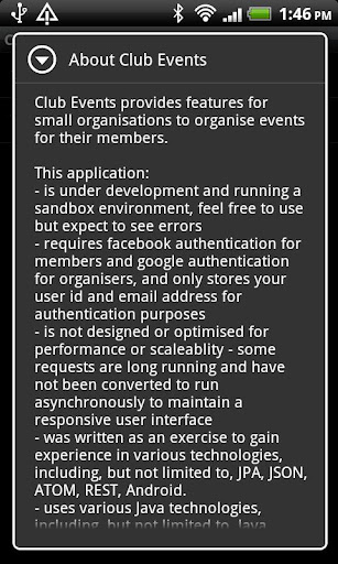 Published events are facebook events, for which members sign up to using this application, by viewing the event in this application. Events can be viewed using the calendar or based on location using the map. In future, a feature to view events by activity type, e.g. Kayaking events, Cycling events, etc is planned.