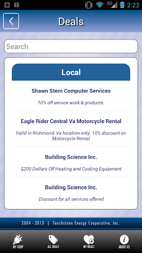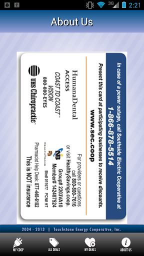 The Co-op Connections(R) program allows consumer-members to obtain details about online, national and local discounts offered by participating Touchstone Energy(R) cooperatives across the country. Use this app to find discounts right at home - or anywhere you travel.