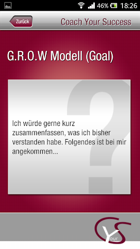 Alle Fragen bedienen sich der Struktur des GROW-Modells (John Whitmore) und gliedern sich in: