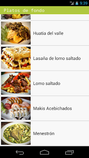 Los platos han sido agrupados en tres categorías: Entradas, platos de fondo y postres; así mismo se presentan en un estilo elegante y divertido que hacen a la aplicación muy intuitiva y fácil de usar.