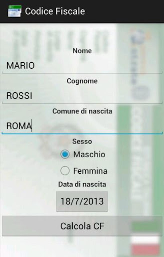 Con questa semplicissima App sarete in grado di calcolare il vostro codice fiscale a partire dai vostri dati anagrafici: nome, cognome, comune di nascita, sesso, anno di nascita.