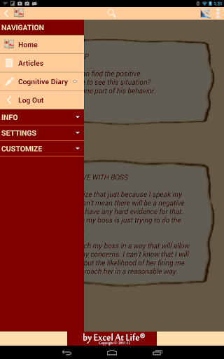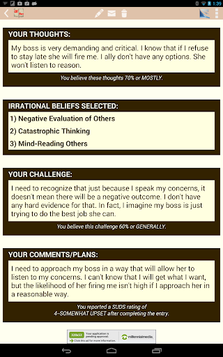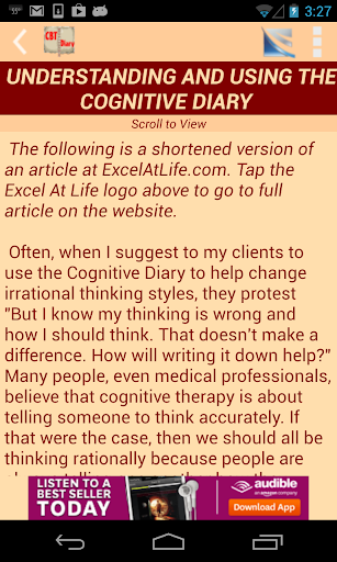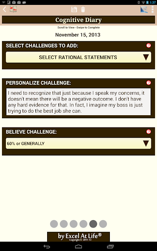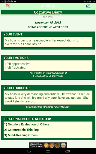 These self-help methods use the tools of cognitive-behavioral therapy (CBT) to challenge irrational thinking. This Cognitive Diary app was developed by a licensed clinical psychologist with over 20 years as a practicing psychotherapist.