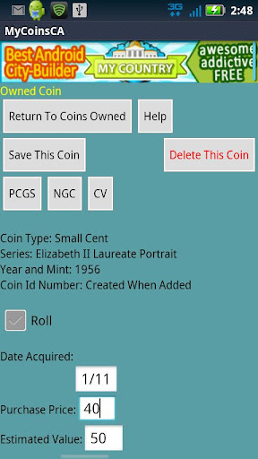 This is a coin collecting program written by coin collectors to organize a coin collection and make personal coin collecting information available anywhere you see a coin or coin collection. If you enjoy this coin collecting application please let your friends know about it so they can have their coin collecting information quickly available. This program is free and the development costs are paid by you clicking on one of the advertisements on the top of the page.