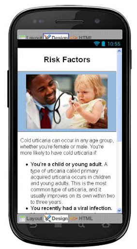 This app contains cold urticaria diseases information for knowledge if you need to apply then please contact to nearby doctor. Useful information but is not a substitute for professional medical advice, diagnosis or treatment. If you think you may have a medical emergency, immediately call your doctor or the emergency services. Before acting on any of the information in this application, consult with your doctor to make sure that it is right for you.