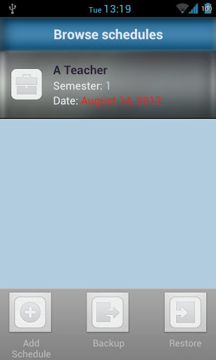 - Restore: recover any of your saved schedules. The app will look for them in the same place where it backs them up.
