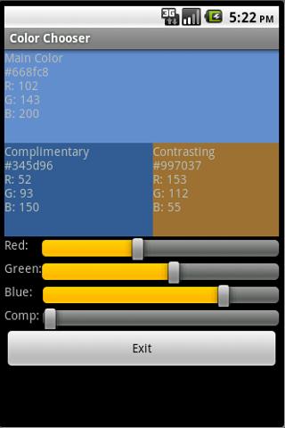 This application simple color picker lets you select a color and then see complimentary or contrasting colors. It is the perfect companion for everything from web development for trips to the paint store. Now with support of the camera, automatically extract the main color of a quick snapshot.
