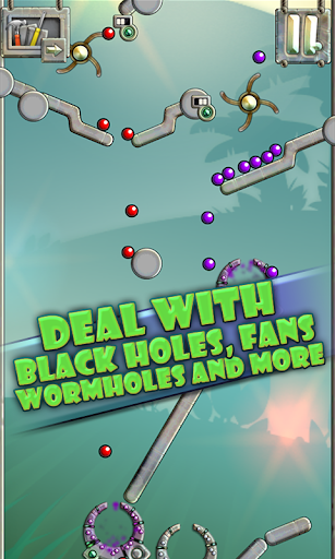 The concept is simple - each level asks you to collect a number of small balls in buckets at the bottom. The balls are stored at the top and await their release. Once you let them go, they will tumble down into the buckets below. Simple? It would be, were it not that many buckets require a specific color, too! To give the little balls their required colors, you need to bounce them off triangular obstacles that you can place freely. These obstacles can be red, yellow or blue, giving you a few options to begin with. As soon as a ball touches one of the colored surfaces, it will transform into that color. These triangles will also split the fall of little balls, allowing you to carefully adjust their flow as they make their way below.