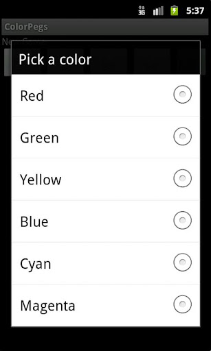 Pick colors for each of four game pegs to see if it matches hidden pegs selected by your Android device. At each turn, you'll learn how many of your pegs match the color and location of a hidden peg. You'll also be told, how many of the rest have the same color but aren't in the correct spot.