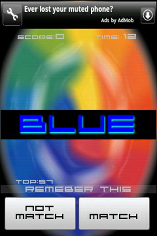 Remember each label that appears, compare each lable with it's significant color, if they match then respond with match or not match buttons, a new label with a color will appear every time you respond. You get points for each correct response.