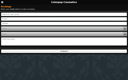 About us, Contact us, Bookings, Services, Pop Card, Events, Photos, Facebook
