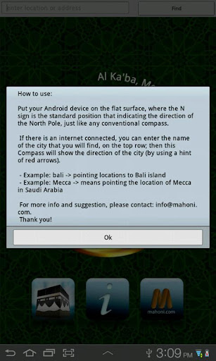 Meanwhile, the other function related showing direction is become the qibla directional utility. As we know, for Moslem follower, it is important to know the direction of qibla, which should be faced when a Muslim prays during salah. It is fixed as the direction of the Ka'ba in Mecca, which is to face the west side. By using this application, the problem finding out the direction of qibla is no longer comes out.