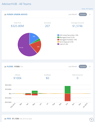 • Check FUM, fee inflows, managed portfolio performance, important notifications, up to date asset values, client contact details and much more